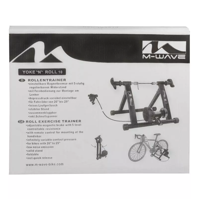 Rollentrainer M-WAVE Yoke 'N 'Roll 10Schnelleinspann- und Einstellgriffeeinstellbare MagnetbremseWiderstand verstellbar mit Fernbedienungzusammenklappbarleises LaufgeräuschGröße: 26 - 29"In den Hometrainer können alle gängigen Rennrad- und MTB-Größen frei von Werkzeugen und ohne Umbaumaßnahmen eingesetzt werden.Für Trainingsvariationen lassen sich über eine Fernsteuerung fünf Widerstände der leise laufenden Magnetbremse einstellen.Zwei oversized Beine aus Stahl sorgen für einen sicheren Stand des Trainers.