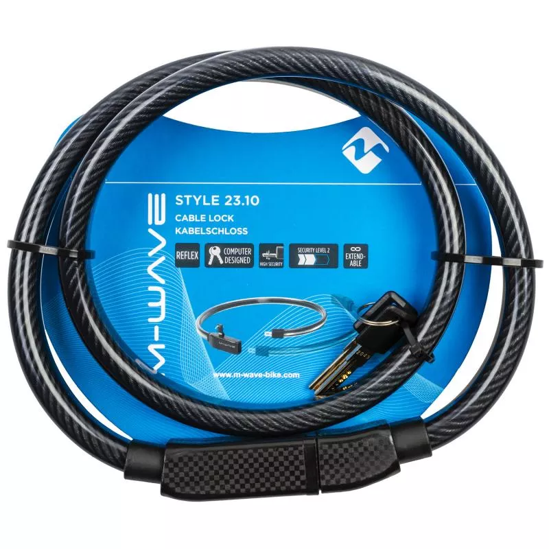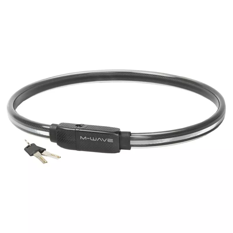Schloss M-WAVE Kabel Schlüssel 12 x 1000 schwarzviele verschiedene Schlüsselvarianten durch computergefrästen Wendeschlüsselautomatische Verriegelungmit transparentem Überzugmit Reflexstreifen