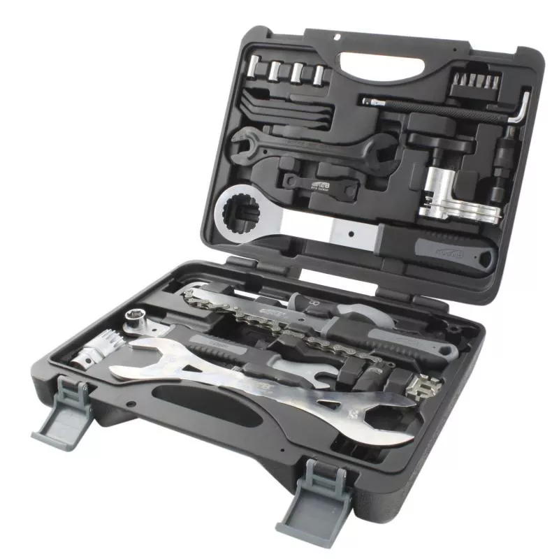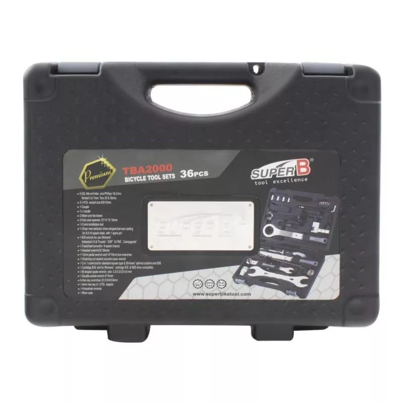 Werkzeug Koffer SUPER-B 36-teilig TBA 2000Inhalt:• 2 Flach- und 2 Kreuzschraubenzieher Bits• 2 Vielzahnschlüssel Bits T25 & T30• L-Schlüssel mit 8/ 9/ 10 mm Außensechskant Bits und Bithalter.• Langer L-Schlüssel mit 8 mm Innensechskant für Kurbelabzieher• Kurbelabzieher• Zanhkranzabzieher• Gabelschlüssel 8/ 10 mm• Zahnkranzpeitsche• Steuersatzschlüssel 32/ 36 mm• Konusschlüssel (13/ 15 + 14/ 16 mm)• Nippelspanner 3,2/ 3,3/ 3,5/ 4,0 mm• Innensechskantschlüssel 2/ 2,5/ 3/ 4/ 5/ 6 mm• Adapter 1/2" Antrieb• Pedalarmschlüssel 14/ 15 mm Außensechskant & 15 mm Maulschlüssel flach• Innenlagerwerkzeug Shimano Vielzahn• Innenlagerwerkzeug für Hollotech II/ Truvativ/ FSA/ Campagnolo außenliegende Lagerschalen.• 8-Zahn Schlüssel für Shimano Octalink II Verschlusskappe• Kettennietdrücker mit Ersatzpin• Kettenblattschraubenschlüssel mit 9/ 10 mm Ringschlüssel• 3 Reifenheber mit Stahlkern